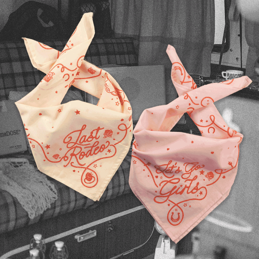 For the bride who’s ropin’ in forever. The Last Rodeo bandana is a little bit country, a little bit bridal, and a whole lot of fun. Designed in creamy white with cherry and pink details, it’s covered in cowgirl rope, stars, hearts, roses, boots, and hats—plus engagement rings and a cowgirl hat with a veil to make sure everyone knows who's ridin’ off into the sunset. Whether she’s toasting with tequila or tearin’ up the dance floor, this bandana is the perfect keepsake for a Western bride’s wildest weekend. Pair it with the Let’s Go Girls Bandana for the ultimate bride-and-crew moment.